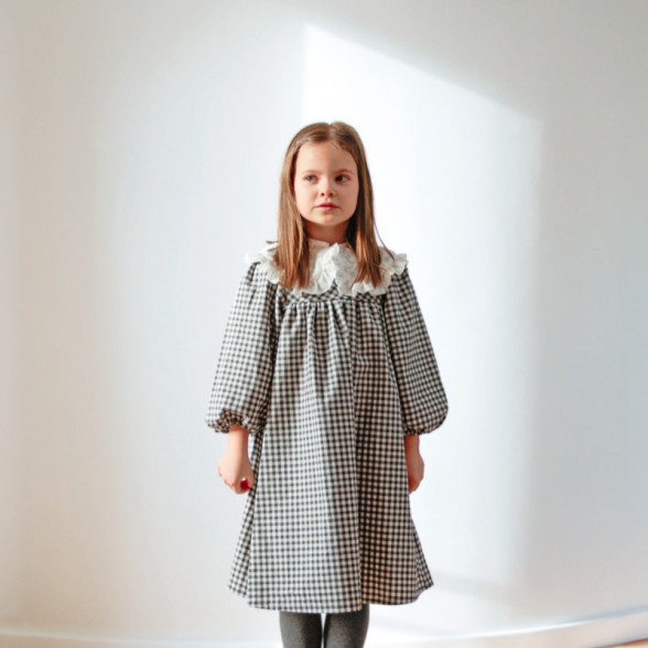 Rūtaina kleita ar balonveida piedurknēm - melnbalta